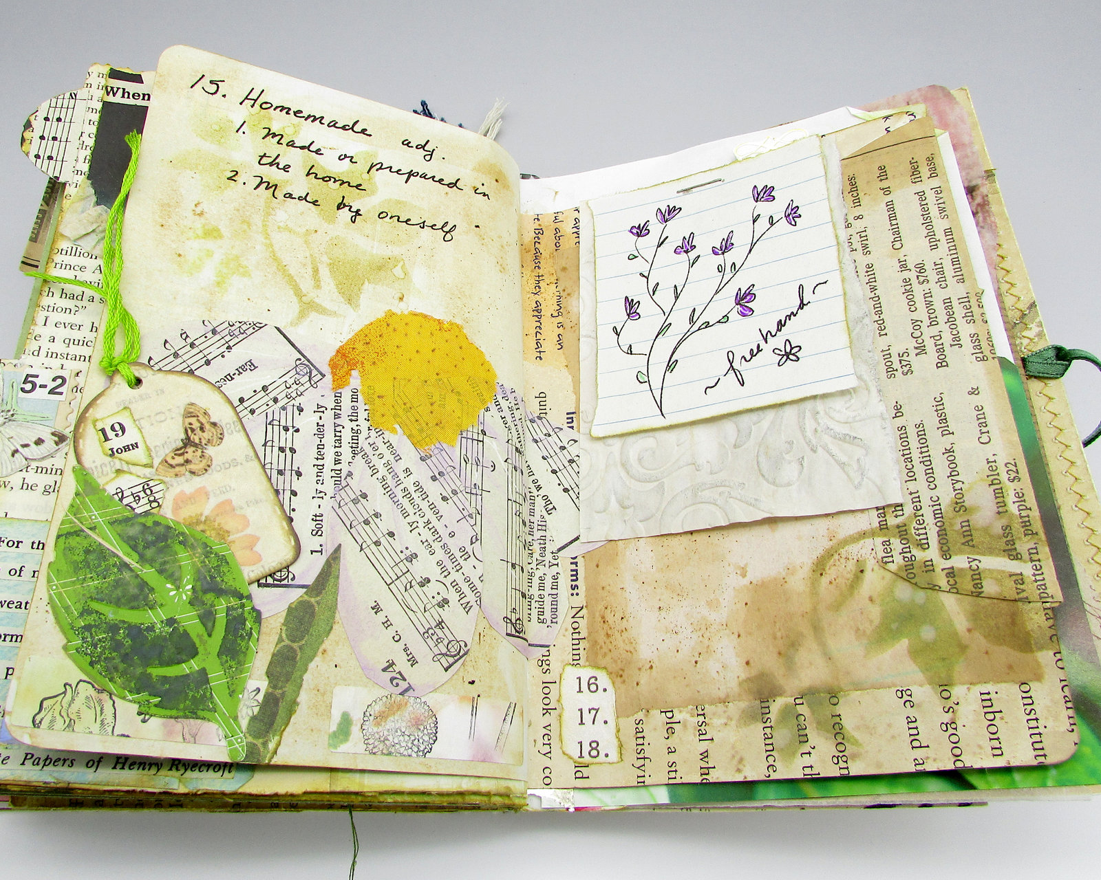 You read that right! I combined the prompts for 5 days (homemade, petal, aged, free, and tag) across this 2-page spread for #JunkJournalJuly. There's no wrong way to complete the monthly challenge! Since all of the prompts could easily apply to previous days, it made sense to combine them and save the few pages I have left in a very chunky journal. In January, I used a prompt to create a puzzle card. This time, the page is the puzzle. All but 1 of the prompts are represented multiple times in the spread.