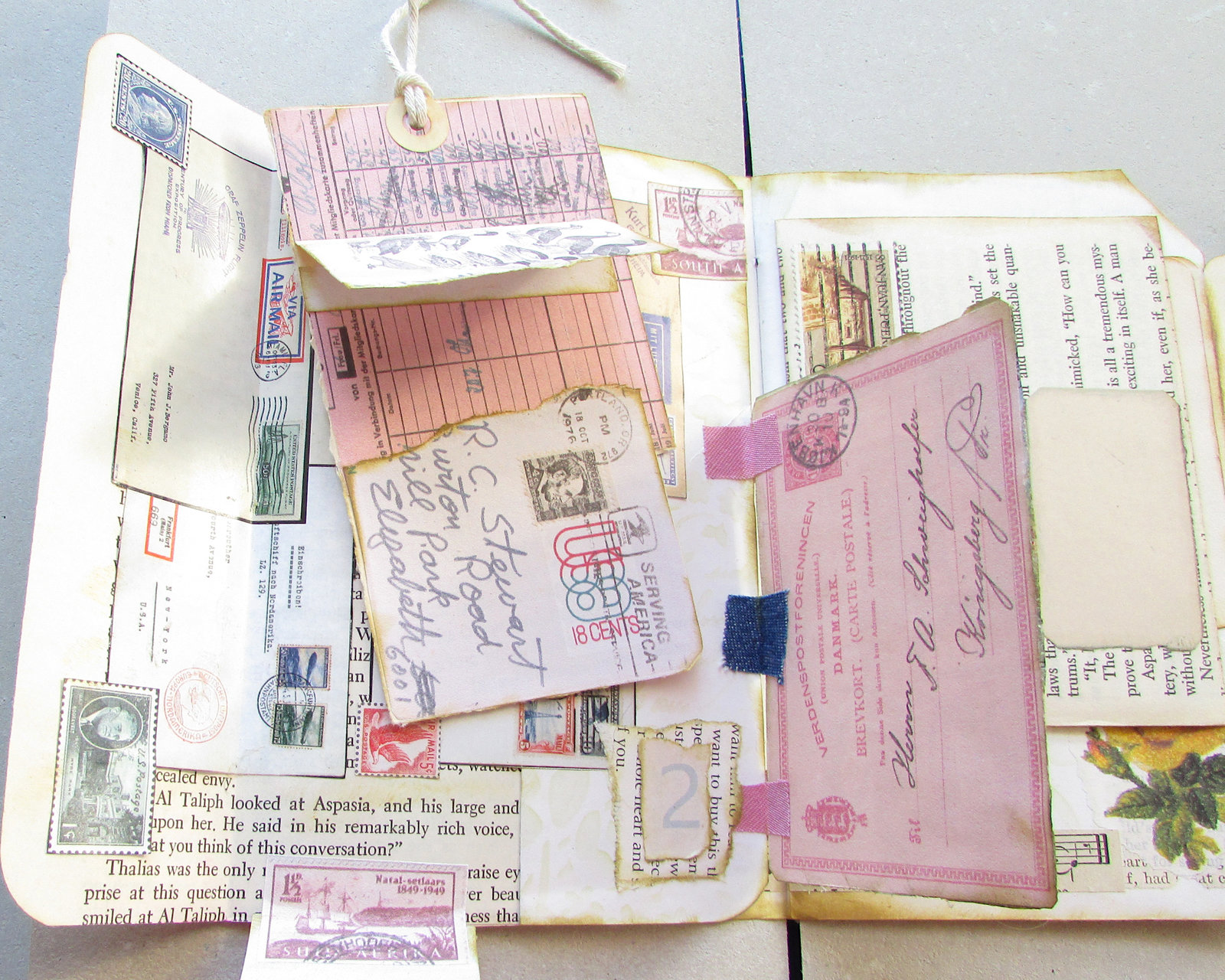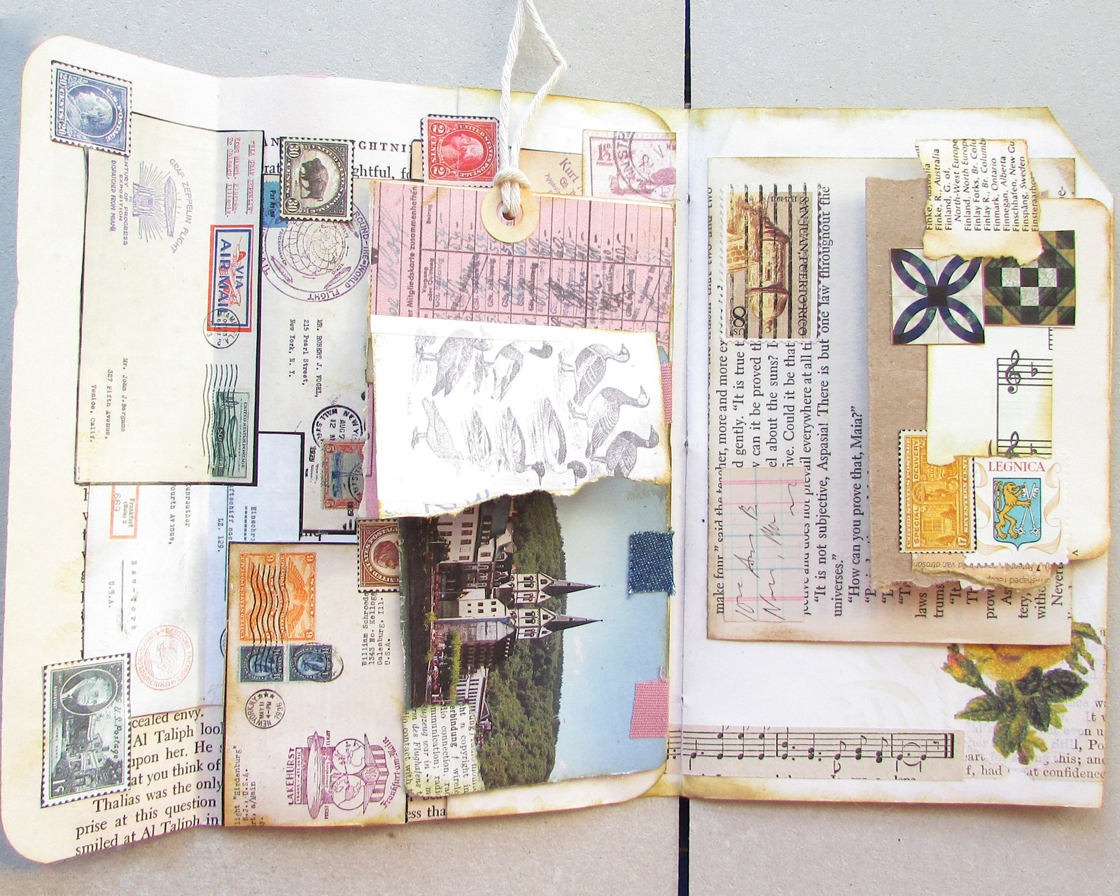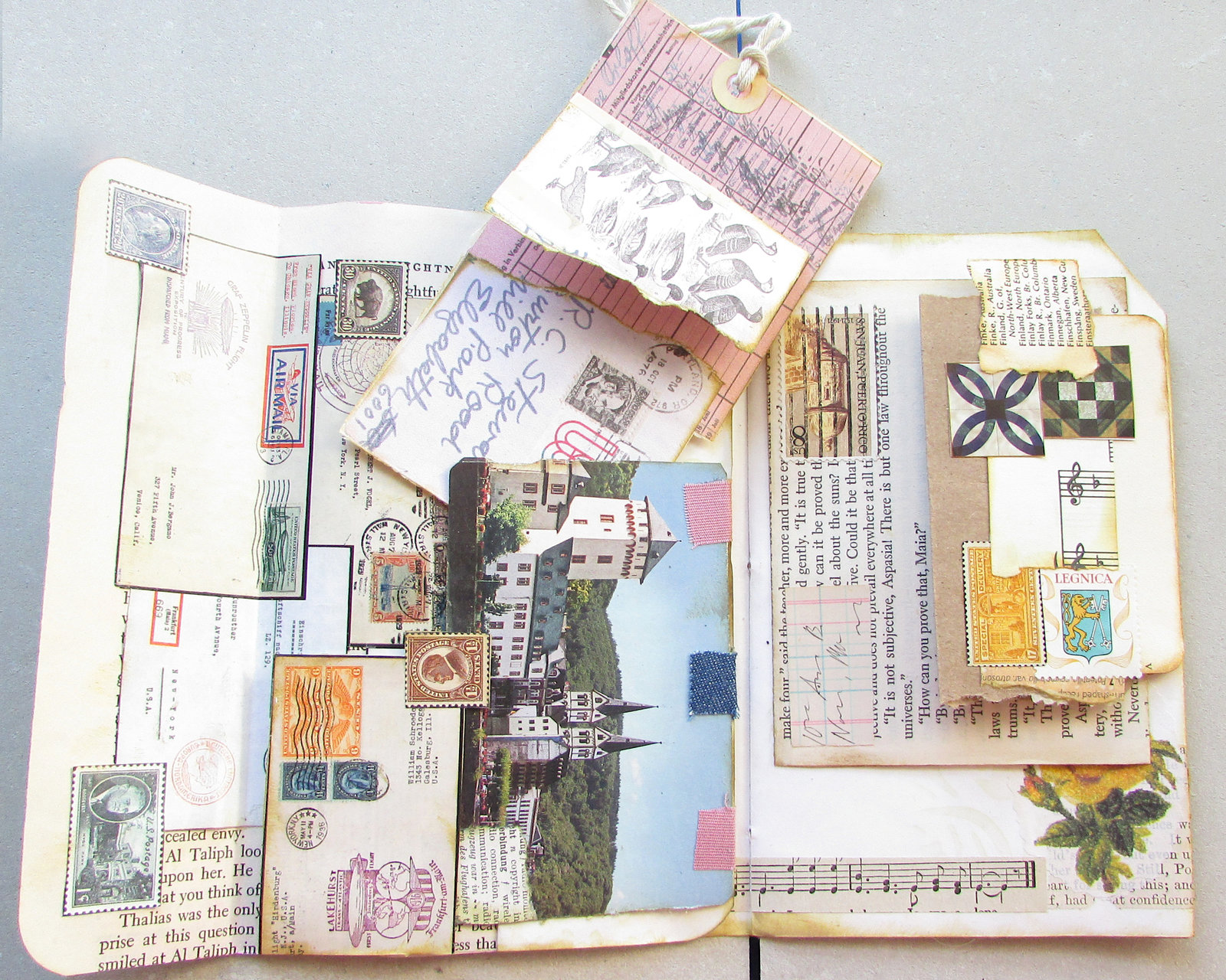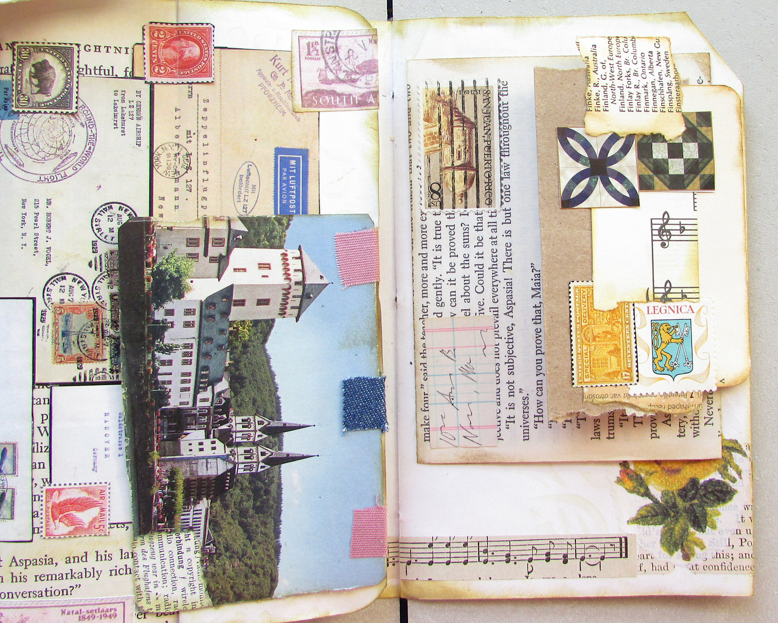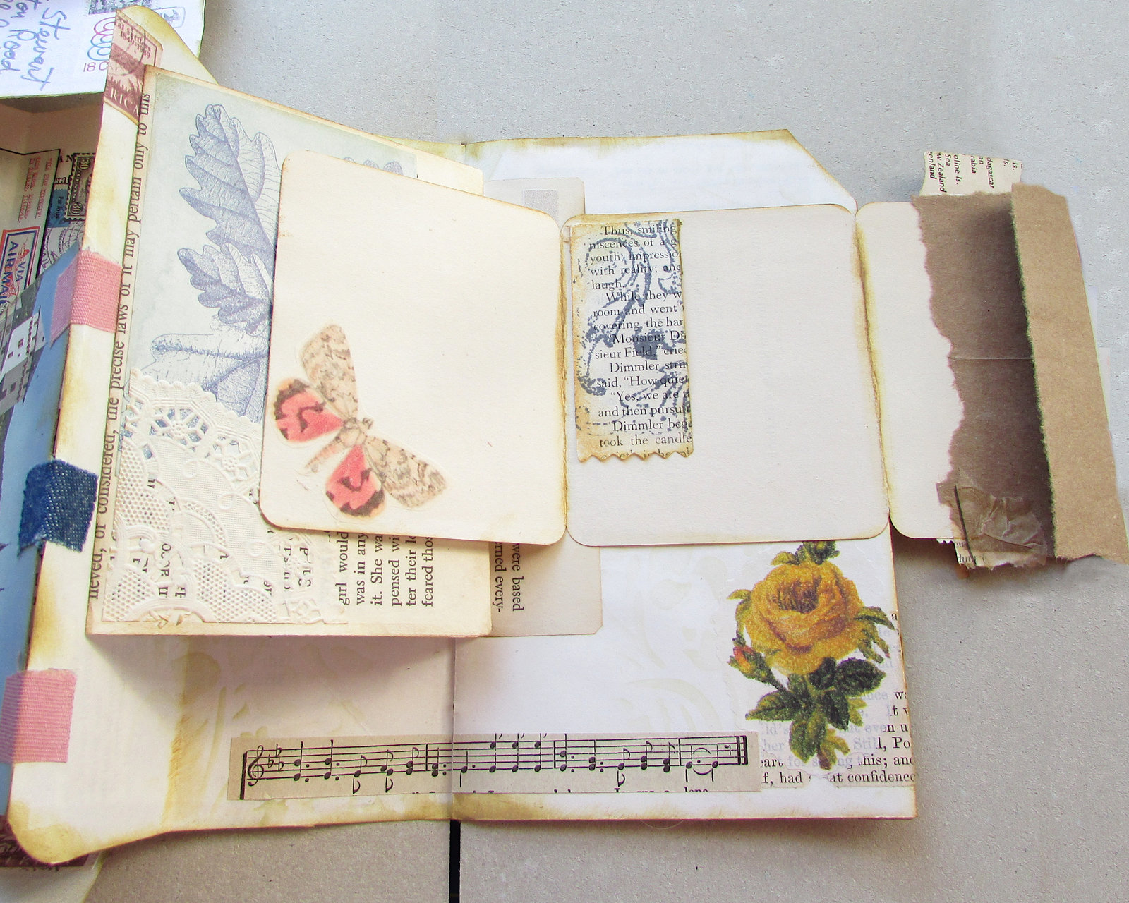 There's a lot going on between these to pages, with faux postcard and letter fold-outs and journaling space hidden under a page fold. The collage and bottom fold-out on the left page came from a vintage stamp catalog. I covered the catalog numbers and added a bit more interest with smaller stamp images. The removable tag is made from #JunkJournalJuly printables from https://getmessyart.com/Junk-Journal-July and backed with vintage book paper. The faux postcard fold-out in the center of the spread uses another of those great free printables, plus an interesting photo from a travel brochure. I used distress ink and matte spray on photo to age it a bit. It's hinged to the edge of a page fold with scraps of vintage fabric. On the right page, faux letters overlap and unfold to the left and right. The yellow rose in the corner was an original feature in the journal, one of the few things too pretty to cover up. If you follow the strip of vintage music paper at the bottom, you'll see it leads into the hidden journaling space between the two pages.