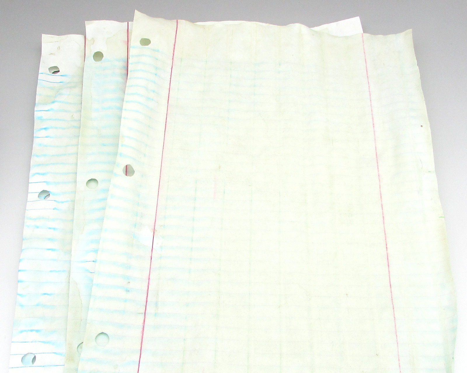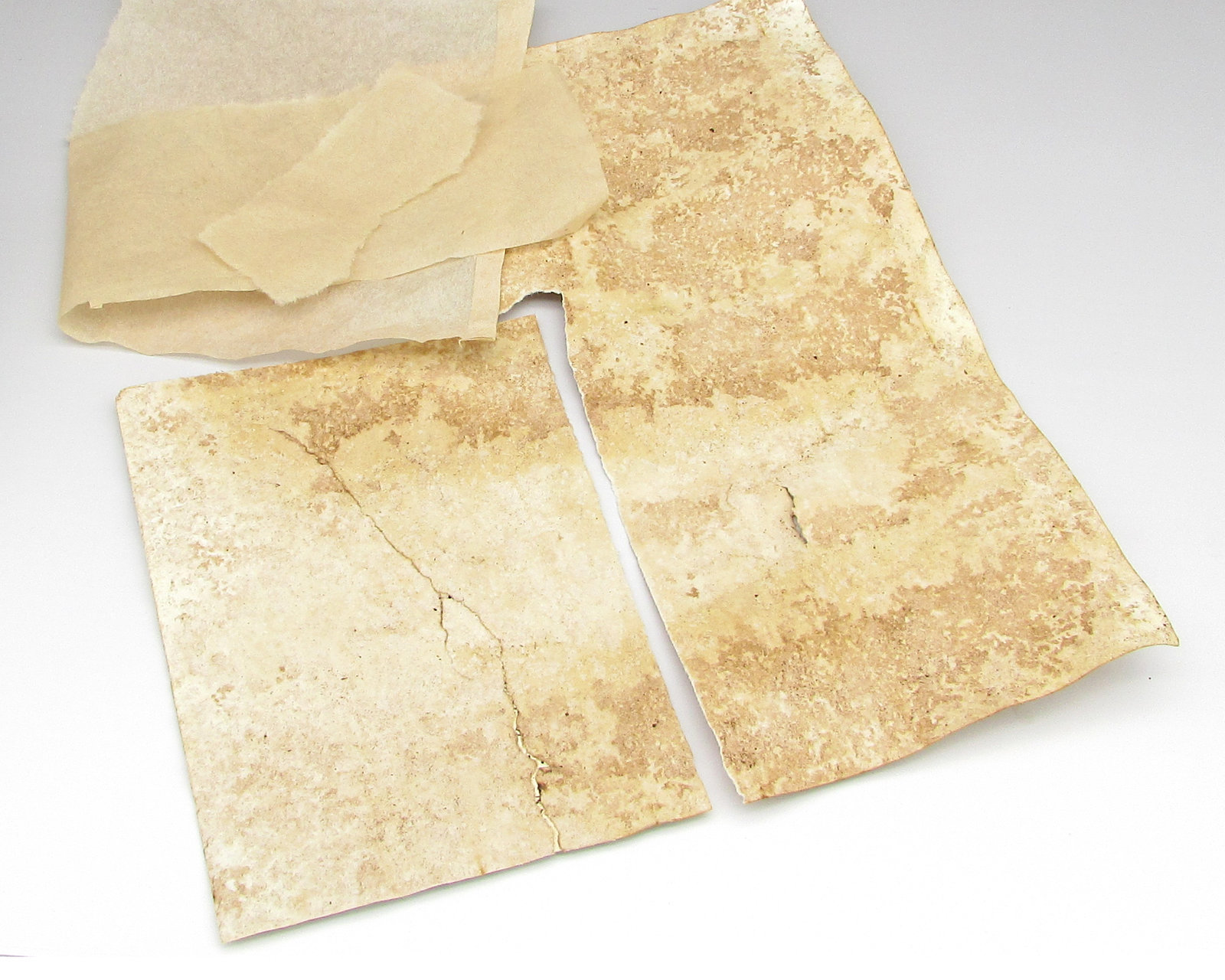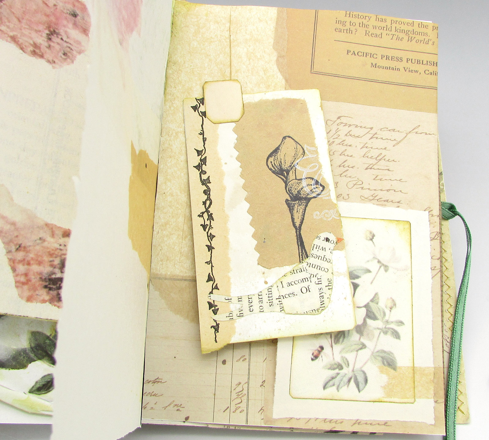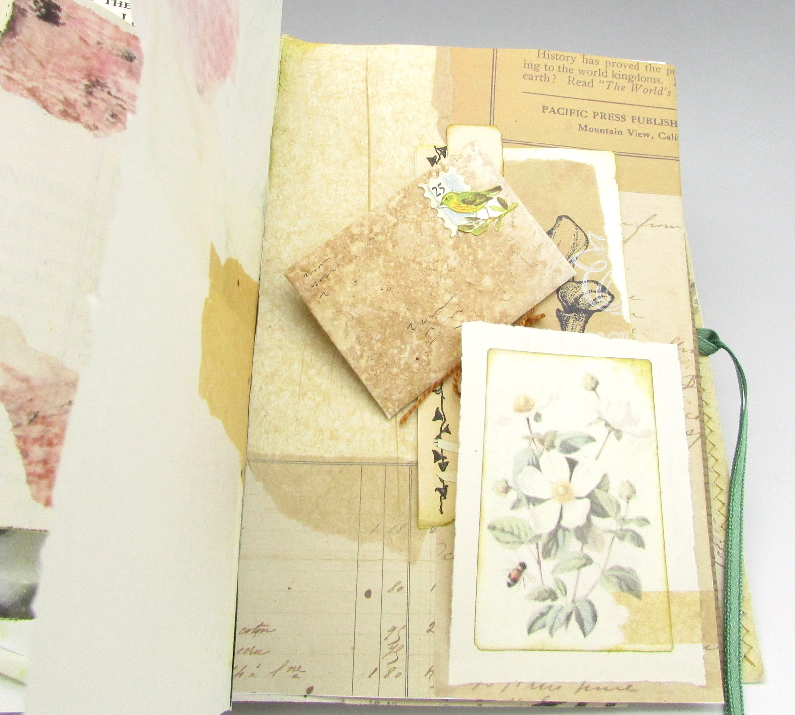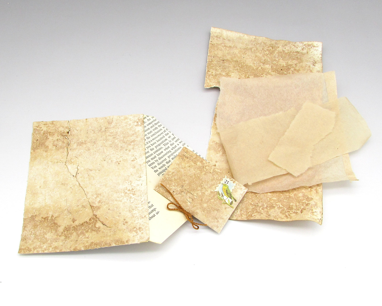 As you can see, my tea-dying session started with a fail. Even a gentle sponging with a used family-sized tea bag turned old loose leaf paper into a blurry mess. Not the look I wanted, so the pages are going back in my horde for another day. A page of my stand-by for dyeing, shortened business letterhead, was ready to go. Shortened business letterhead is what one does when corporate document shredding directives endanger a ream of very nice paper. I decided to experiment, so after carefully cutting the damp tea bag open, I spread the tea leaves over the page in a thick layer. After about 10 minutes, I carefully rolled the page up (tea leaves and all) and let it sit a bit more so that the page would be colored on both sides. When it was time to unroll and dry the page, I wasn't careful enough when brushing away excess tea leaves. To keep from tearing it more than I obviously did, I stopped the leaf removal immediately, gently laid the paper on a rack, set the rack on a sheet pan, and baked it for 10 minutes at 250F. Once the page was out of the oven, I used a dry paper towel to remove the remaining tea leaves. The resulting page was fabulous! To make the most of the tear, I glued that section to the back of a handmade envelope. But... the lovely envelope was too large for the page spread so had to go live in the aforementioned horde. So... I cut a 3" square from the tea dyed page to make a tiny envelope (approx. 2.5"x1.75"). Alas, when I added the faux stamp and faint scribbled address lines I forgot to check whether the envelope was right side up. Another fail! Bravely pressing on, I added a 4-page signature to the envelope flap using scraps of tea bag and tracing paper. This too was a fail! I had a third folio in the signature but it slipped out when I sewed it to the envelope (because I thought the stack was too small and thin to need more than just my fingers to keep it in place). Not shown (because it's not neutral shades): a tiny tabbed journaling card made to fit in the envelope's pocket. To give the page tuck more to do, I slipped in a small collaged journal card.