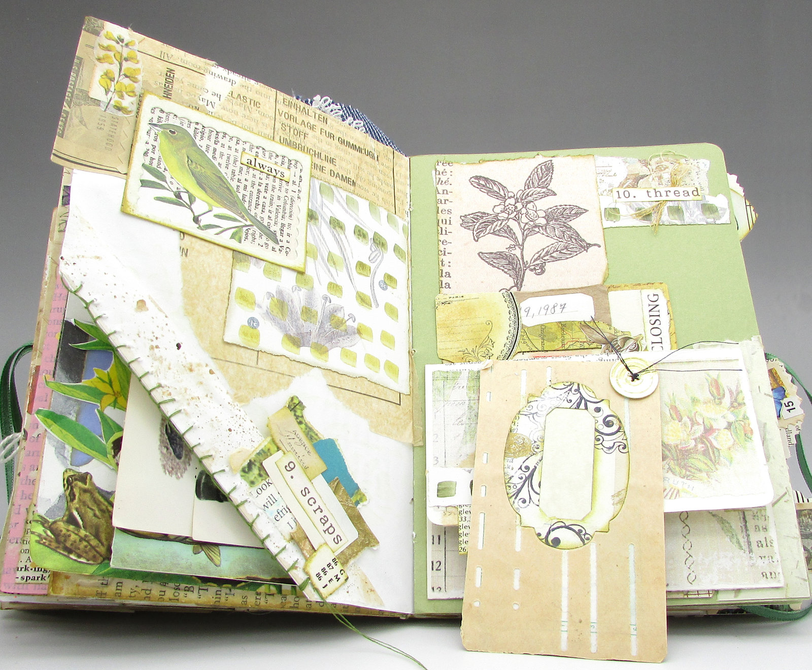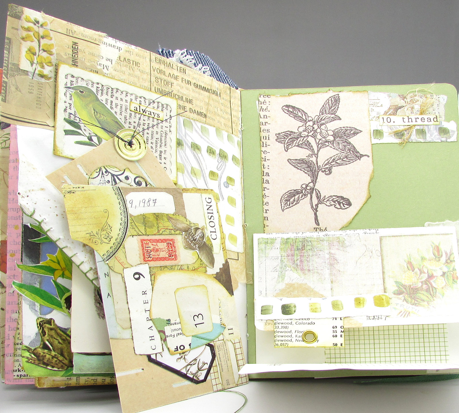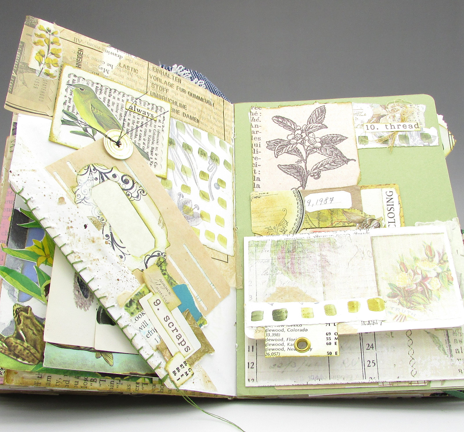 So... here's what went into this spread. On the first page, I added some more neutral colored scraps and pattern tissue to the book page scraps that were already at the top. Since I wanted the page to coordinate with its neighbor, I did a bit of watercolor mark-making on a scrap page from a botanical book. While the framed bird doesn't look particularly scrappy, the frame is a die cutting scrap, the background is a scrap of dictionary page that was in my scrap bin, and the "always" was cut from another piece in the scrap bin. Since I'm always using scraps, it's an appropriate word for this spread. I used a coffee-spattered scrap to make an angled tuck point at the bottom of the page and hand-stitched it with green thread. It's not the best job, but the rustic look goes with the scrap theme. I added a label (made of scraps, of course) to the bottom of the tuck spot. If the journaling card looks familiar, it's because you saw a much larger version for July 4. I wasn't really happy with the journal card I had made (and photographed), so cut it in half and added a few bits to make two smaller cards that I like much better. This card got the addition of a button die cut from a scrap of foiled cardstock. I sewed it onto the card with dark blue thread, leaving the tails long to call attention to the next day's theme: "thread".